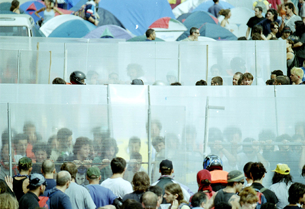 Il corteo del Carlini è così disposto: in prima fila un cordone di parlamentari, avvocati e portavoce con i documenti e le autorizzazioni, poi i grandi scudi mobili di plexiglass che coprono la testa e i fianchi del corteo, quindi i ragazzi e le ragazze dei centri sociali con caschi di plastica e armature finte, infine una folla enorme.