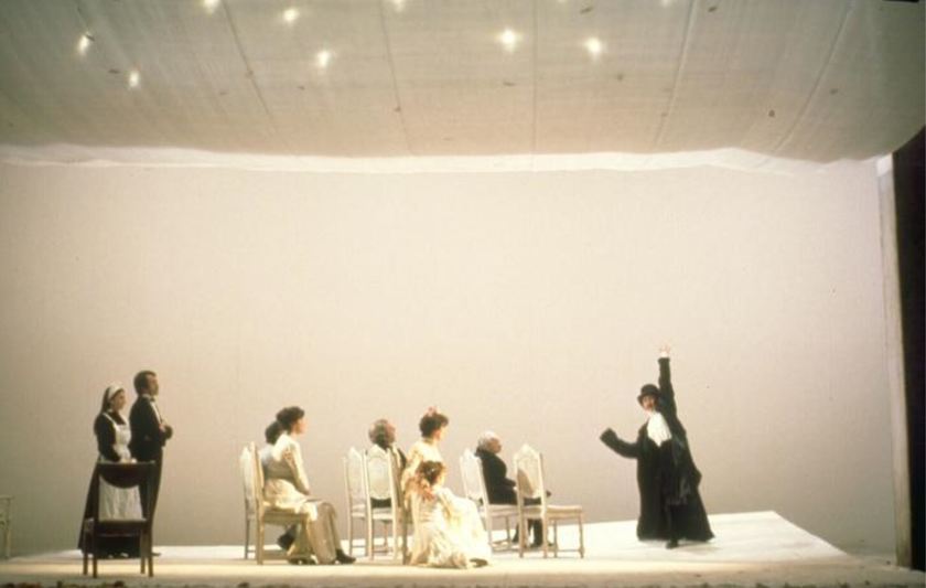 Esaminando Il giardino dei ciliegi (già rappresentato nel 1955) è stato scritto: «Per Strehler è la storia dell’uomo a imporsi con una propria realistica fermezza su qualsiasi altra prospettiva di analisi. Eppure la magia di ogni singola scena fa emergere la poetica di tutto il dramma, caricandolo di profondi significati emozionali. Come in un gioco di scatole cinesi, il regista infonde nel suo spettacolo le tre fondamentali componenti della poetica cechoviana»: il Vero, la Storia, la Vita (Nadia Palazzo). Mi limiterò a citare la scena finale: l’addio doloroso della grande protagonista Valentina Cortese (Liuba), svagata, fragile, contraddittoria, e della sua famiglia al proprio luogo di appartenenza, lo scenario bianco di teli che coprono tutto, le luci che si spengono, il vecchio servitore (Renzo Ricci) dimenticato custode della memoria, mentre il nuovo avanza, simboleggiato dal rumore assordante di asce e seghe che stanno già abbattendo i bellissimi ciliegi, retaggio del comune passato. Ancora una volta un cast di straordinario rilievo: Gianni Santuccio (poi Renato De Carmine), Franco Graziosi, Giulia Lazzarini e la giovanissima debuttante Monica Guerritore.
