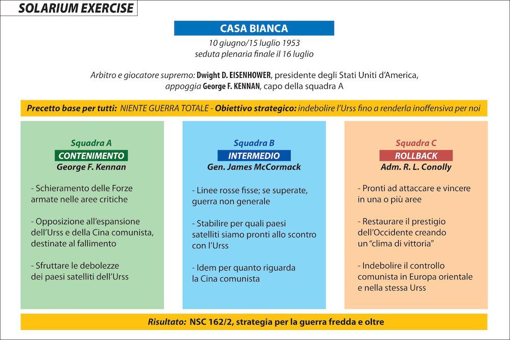 Conviene che la Russia imploda sotto le pressioni atlantica e cinese o non sarebbe più opportuno per la Nato e i suoi alleati ricercare una cooperazione con la Russia nell’opera di contenimento dell’espansione cinese? Per rispondere a questa domanda Caracciolo ricorda un avvenimento storico fondamentale, tenuto segreto per molto tempo e riemerso solo negli anni Ottanta, il Solarium Exercise di Dwight D. Eisenhower, cui rinviamo i lettori e le lettriciperché rappresenta un ottimo strumento per comprendere che cosa sia stato il cosiddetto containment americano dell’Unione Sovietica prima e della Russia poi.