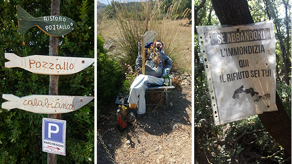 Da questo tratto cominciamo a incontrare delle auto, da cui scendono turisti con infradito e ombrelloni diretti alla spiaggia del Pozzallo, la prima e più frequentata delle Cale. Lo sterrato, in discesa, offre scorci panoramici di rara bellezza, in un tripudio di siepi di lentisco, rosmarino e di varie qualità di vegetazione mediterranea. All’inizio un simpatico spaventapasseri che ricorda Braccio di ferro indica una mescita di acqua che non c’è e serve di monito agli escursionisti improvvisati.