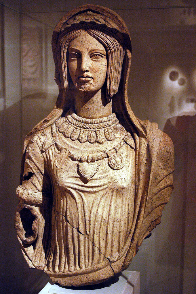 Larthia Seianti, la dama del Museo Archeologico Nazionale di Firenze, è vestita con una lunga tunica stretta in vita decorata con borchie e porta preziosi gioielli d’oro, un paio di vistosi orecchini a disco e un braccialetto sul bicipite. La fanciulla, una scultura a grandezza naturale, conservata al Metropolitan Museum, veste una tunica aderente che mette in evidenza il seno e porta elaboratissimi e ricchi gioielli con raffigurazioni di divinità.