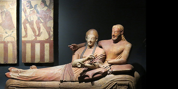 L’opera più famosa nel mondo, il Sarcofago degli sposi di Cerveteri, conservato presso il Museo Nazionale EtruscodiVilla GiuliaaRoma, mostra i due sposi sdraiati sul letto tricliniare mentre si abbracciano teneramente.