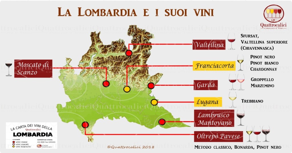Territorio vasto, dalla conformazione composita, alterna zone montuose, collinari e pianeggianti, solcate da numerosi fiumi e laghi di diversa ampiezza. L’area vitivinicola più importante è la Valtellina, valle orizzontale attraversata dal fiume Adda, ove i vigneti crescono su terrazze lungo le pendici montuose. Qui il nebbiolo prende il nome di “chiavennasca”, con cui si realizzano gli ottimi vini del Valtellina Superiore Docg e dello Sforzato Docg. Nella sottozona più piccola del Valtellina Superiore Docg, che si chiama “Inferno”, il nebbiolo gode di un microclima particolare, grazie alla perpendicolarità dei raggi del sole, che provoca un innalzamento delle temperature in estate, conferendo al vino delle proprie caratteristiche. E ancora l’Oltrepò Pavese, la zona più estesa, ove si coltivano barbera, croatina, uva rara, pinot nero, oltre a riesling, moscati e malvasie destinati alla spumantizzazione. Fra le altre zone vitivinicole si annoverano: Valcalepio, a nord di Bergamo, ove si produce il celebre Moscato di Scanzo, uno squisito vino rosso da dessert; poi ancora l’area di San Colombano al Lambro, sulla sponda lombarda del Garda, e la provincia di Mantova. Non ultima, la Franciacorta – il cui nome non è attinente alla Francia, dove pure si produce champagne, sempre secondo il metodo classico, detto “champenoise”, ma sembra derivare da Frances Cortes, ossia “corti franche”, possedimenti religiosi esenti dalle tasse – in provincia di Brescia; è il regno degli spumanti italiani ottenuti con il Metodo Classico, metodo di spumantizzazione per eccellenza, con il quale si ottengono gli spumanti di migliore qualità, struttura e complessità, a partire da uve chardonnay, pinot nero e pinot bianco, vendemmiate precocemente per garantire ai vini una buona acidità e che subiscono una seconda fermentazione, ossia la rifermentazione in bottiglia (a questo proposito, per chi volesse approfondire l’argomento rimando all’articolo per la serie Enoteca dedicato interamente alle bollicine).