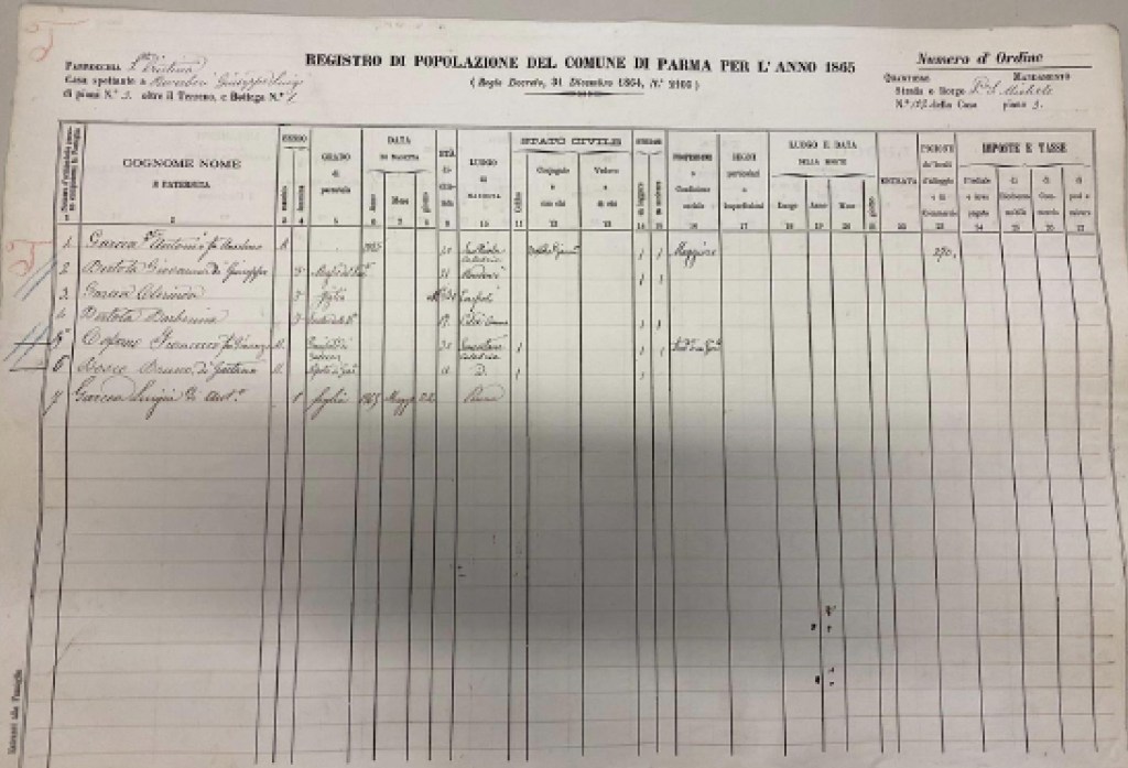 Il nostro viaggio alla ricerca della storia di Giovanna (Giovannina) Bertola, è iniziato tra le mura dell’Archivio Storico di Parma. Qui, assistite da Francesca Belmessieri, abbiamo toccato con mano i documenti che attestano la sua permanenza nella nostra città: il registro di popolazione del Comune di Parma dell’anno 1865, con cui abbiamo recuperato l’indirizzo di residenza e i nomi dei conviventi della famiglia, il certificato di nascita della figlia Garcea Luisa Letizia in cui vengono riportate anche informazioni riguardo alla sua unione con Olmi Carlo nel 1887. Ci siamo quindi messe in contatto con l’Archivio Diocesano di Mondovì (CN), che ha provveduto a fornirci l’atto di nascita e di battesimo di Giovanna Bertola.