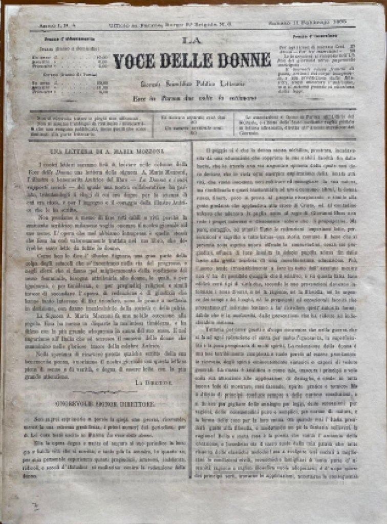 Infine ci siamo recate presso la biblioteca Palatina di Parma per visionare la prima edizione della Voce delle donne, pubblicata il 1 gennaio 1865. Toccare con mano documenti così antichi è stato per noi un’esperienza emozionante: trovarsi di fronte a una stampa originale ha ricompensato il nostro “lavoro investigativo” e soprattutto ci ha insegnato la bellezza e il valore della ricerca nel vero senso della parola, un’esperienza che non avremmo mai potuto vivere se non andando in prima persona sul campo.