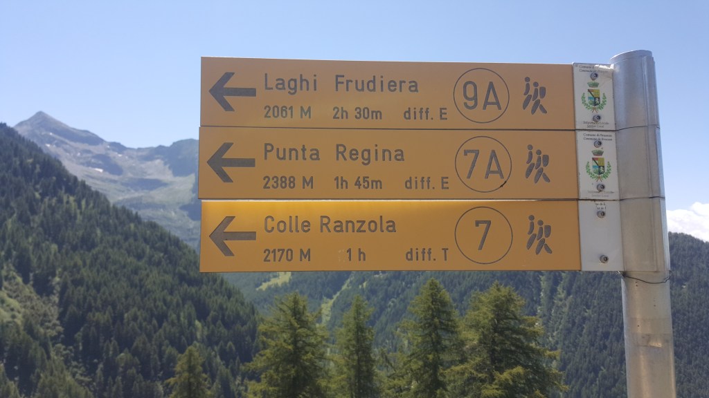 La partenza di questo breve ma appagante itinerario può essere o dal comodo parcheggio di Estoul o proseguendo da lì in auto su asfalto e poi su sterrato, fino al divieto di accesso dove si trovano i cartelli segnaletici del percorso che ci porterà prima al Col di Ranzola e poi a Punta Regina (metri 2388).
