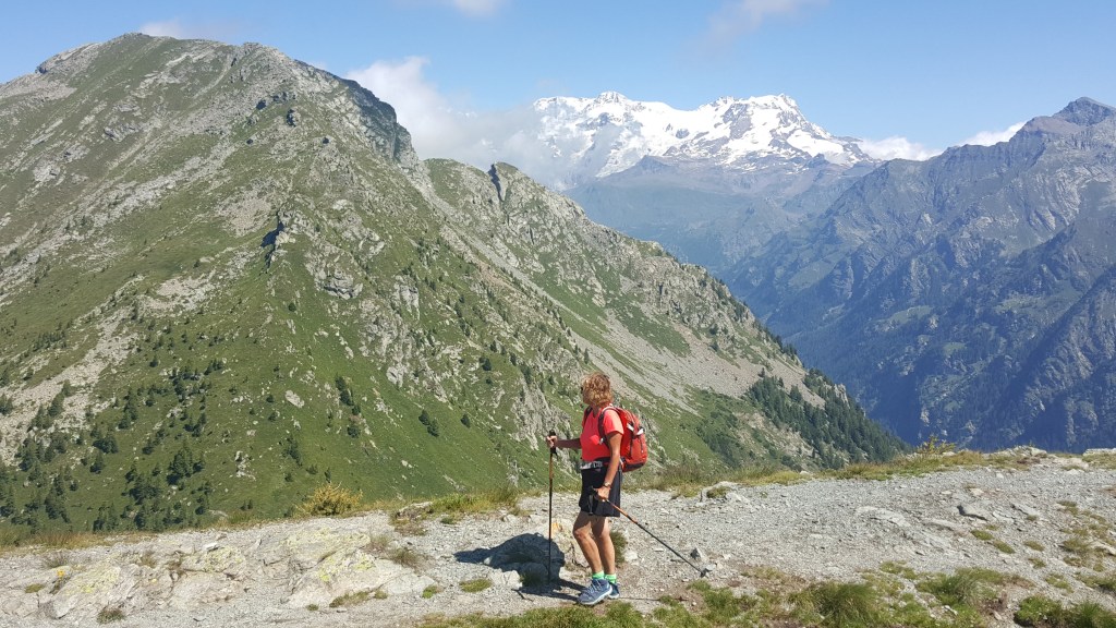 Il colle era anche utilizzato dagli emigranti valsesiani che, attraverso il Colle Valdobbia e questo valico, raggiungevano la Val d’Ayas per dirigersi poi verso il Vallese. Sul colle il cartello col segnavia 7 a ci indica che, in 40 minuti di salita impegnativa, con forti pendenze ma sempre su sentiero ben tracciato, sarà possibile raggiungere una cima. Man mano che ci si alza di quota il panorama spazia sulla Valle di Gressoney e su parte del gruppo del Monte Rosa. Su questo tratto sono un prezioso aiuto le bacchette (da impugnare basse nei passaggi più ripidi di salita). Oltrepassati gli ultimi larici “resilienti”, la salita diviene meno difficoltosa e in pochi minuti siamo su Punta Regina (metri 2388). La veduta abbraccia il Gran Paradiso, il Bianco e le vicine Dame di Challand. Con un buon binocolo si riescono a vedere la Capanna Margherita e, ancora più vicino, il Rifugio Ospizio Sottile al Colle Valdobbia. Foto di rito sulla cima e spuntino con barrette e frutta.