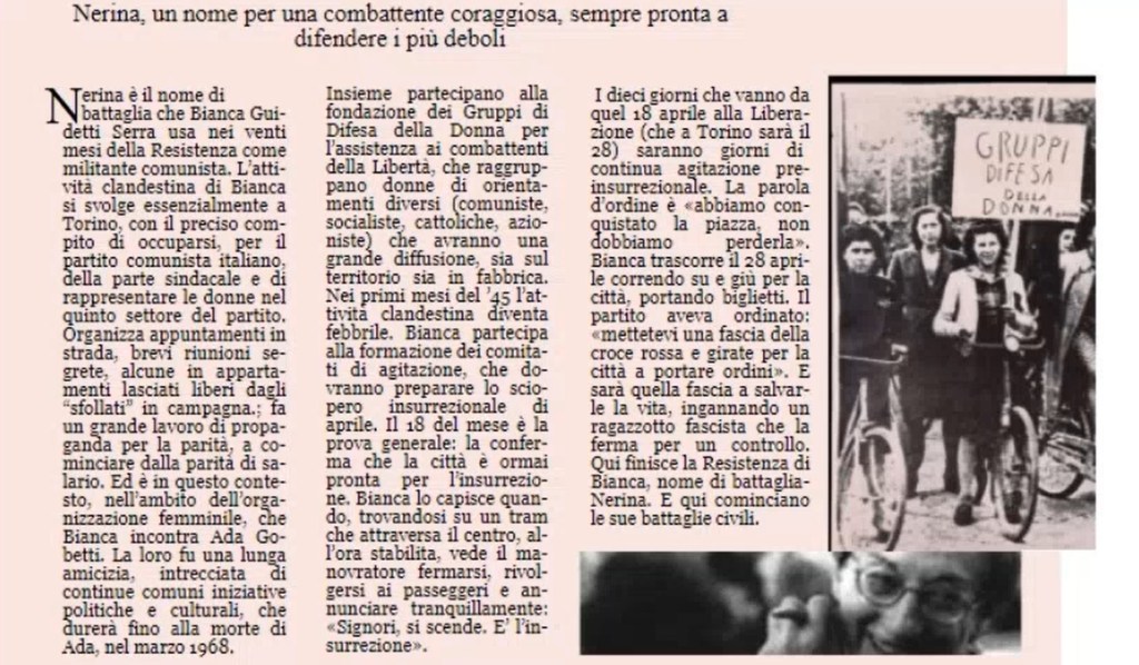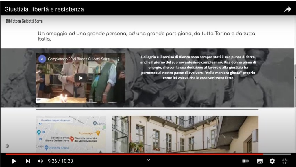Il video termina con un breve filmato che ritrae Guidetti Serra durante i festeggiamenti nel Centro Studi Gobetti per i suoi novant’anni e con una panoramica sulla biblioteca civica torinese a lei intitolata nel 2019 in occasione del centenario della sua nascita.