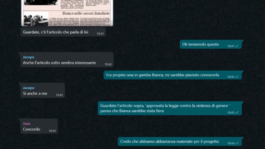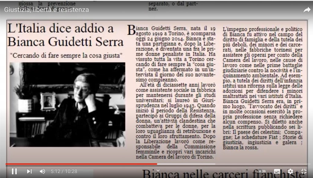 Questa la motivazione della giuria del concorso: «Il video racconta, attraverso la simulazione di uno scambio di messaggi, un percorso di avvicinamento e conoscenza di tre studenti liceali di oggi alla figura e all’attività di Bianca Guidetti Serra (1919-2014), che fu partigiana, militante politica e, come avvocata, protagonista di alcune delle più importanti battaglie per i diritti delle donne e dell’infanzia nell’Italia del secondo dopoguerra.