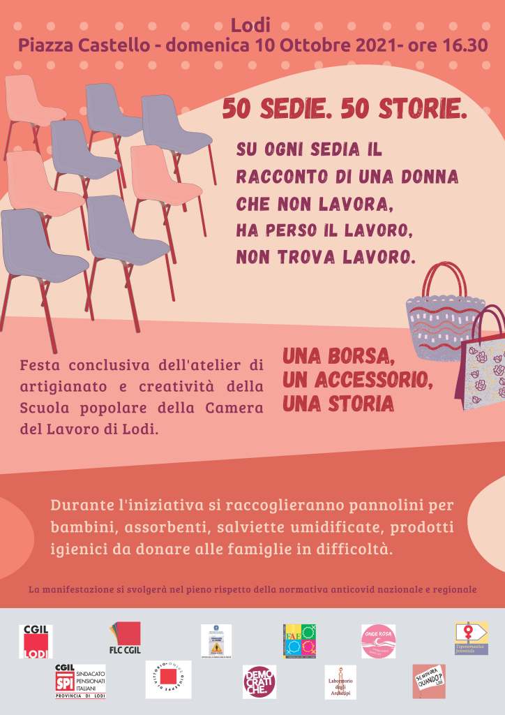 Domenica 10, Tf ha preso parte all’iniziativa 50 sedie. 50 storie organizzata a Lodi, a piazza Castello. L’evento, che ha previsto l’istallazione di 50 sedie vuote con i cartelli di posto occupato, si è svolto con la lettura di interventi e pensieri a tema “donne e lavoro”. A ciò si è aggiunta una mostra di prodotti — borse e accessori — realizzati nel laboratorio Una borsa, un accessorio, una storia, svoltosi presso la Camera del Lavoro di Lodi e durante il quale sono state raccolte e scritte alcune testimonianze, lette poi ad alta voce, le quali, debitamente illustrate, sono state riprodotte in un libricino distribuito gratuitamente durante l’iniziativa. Vi è stata, inoltre, una dimostrazione dal vivo della realizzazione di borse, con l’istallazione di due macchine da cucire e la partecipazione di due donne che hanno frequentato il laboratorio. Per Tf erano presenti la vicepresidente Danila Baldo con le associate Daniela Fusari, Katia Menchetti, Daniela De Carlo e la Consigliera di Parità provinciale Venera Tomarchio.