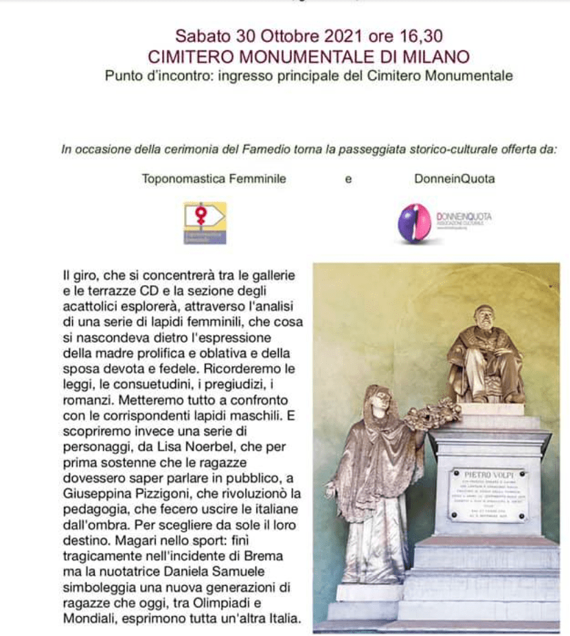 Il giorno 30, Toponomastica femminile e Donne in quota hanno organizzato una visita guidata al Cimitero Monumentale di Milano, con la giornalista Valeria Palumbo a fare da Cicerona.