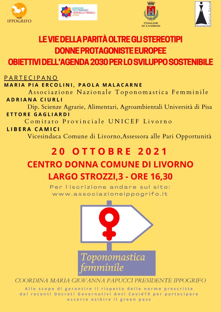 Nella stessa giornata, Maria Pia Ercolini e Paola Malacarne hanno partecipato all’iniziativa del comune di Livorno Le vie della parità oltre gli stereotipi. Donne protagoniste europee. Obiettivi dell’agenda 2030 per lo sviluppo sostenibili, il tutto coordinato da Maria Giovanna Papucci, presidente dell’Ippogrifo, associazione che dal 1987 opera in vari ambiti della cultura e della promozione sociale, attuando campagne di sensibilizzazione, progetti di formazione e organizzazione di eventi e iniziative tese a promuovere il cambiamento culturale.