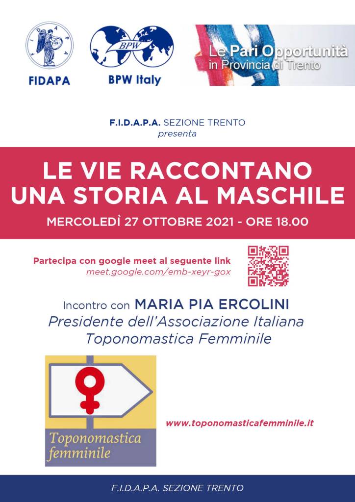 Il giorno 27, la F.I.D.A.P.A., sezione di Trento, ha organizzato un incontro con la nostra presidente, dal titolo Le vie raccontano una storia al maschile.