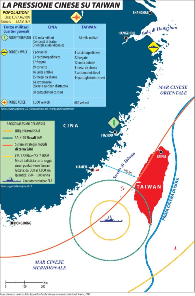 Dal 2015 l’Esercito popolare di liberazione (Epl) ha pattugliato le acque intorno e oltre Taiwan. Il numero di voli militari cinesi intorno all’isola nei primi sette mesi del 2021 è arrivato a 360, con l’impiego di diversi modelli di caccia, aerei da avvistamento, apparecchi per il disturbo delle telecomunicazioni, aerei antisottomarino e bombardieri. Inoltre navi da guerra cinesi, portaerei incluse, incrociano nelle acque vicine.