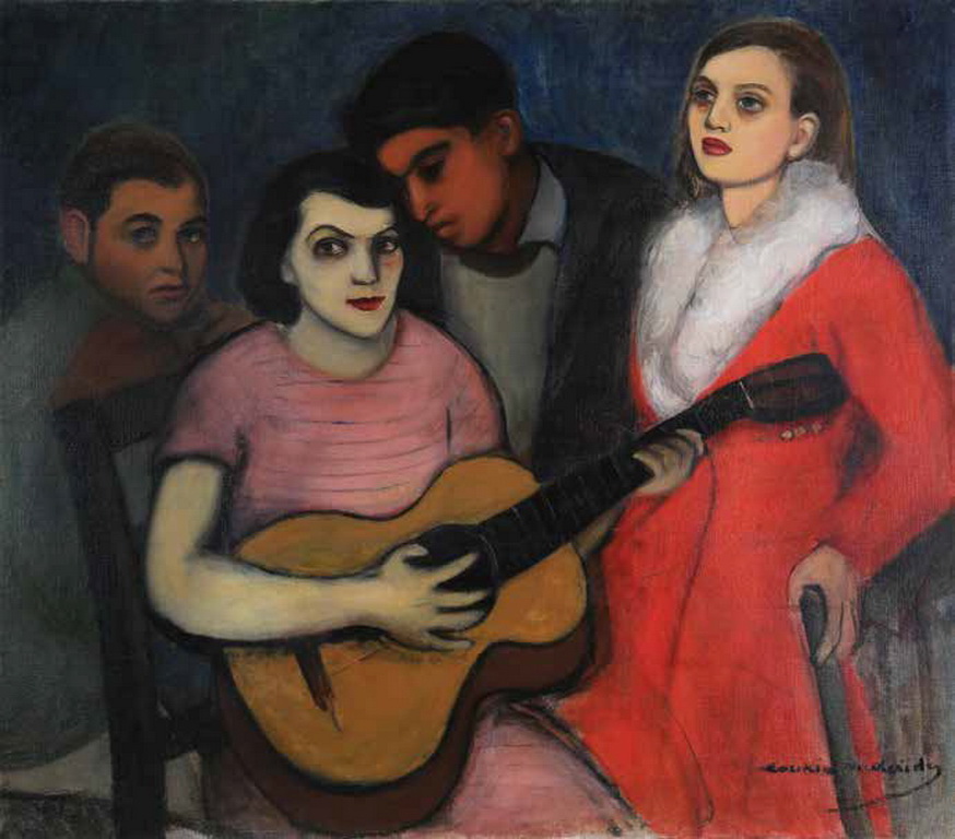 Nel dipinto Prosopografia mias Filis [Ritratto di una ragazza], Nicolaidou va ancora oltre e rifiuta il ruolo di una donna come musa di un artista maschile (Lamprou: 2014). Questo dipinto è dominato dall’imponente figura di una pittrice che copre l’intera tela. Si fa avanti, non dà il permesso allo sguardo dello spettatore di sfuggire alla sua realtà, non vuole essere piacevole o carina, non sorride. Tiene i pennelli, gli strumenti del suo lavoro, in un modo molto professionale, non permettendo a nessuno di vedere cosa fa come fosse una leggera occupazione passatempo. Questo dipinto in particolare può far dialogare Nicolaidou con altre donne pittrici -una questione importante se si considera la narrativa che vuole che le donne siano influenzate dai colleghi maschi; una narrativa che vuole che le donne vivano e creino nell’ombra di un uomo, senza dialogare tra loro.