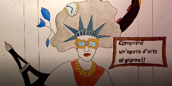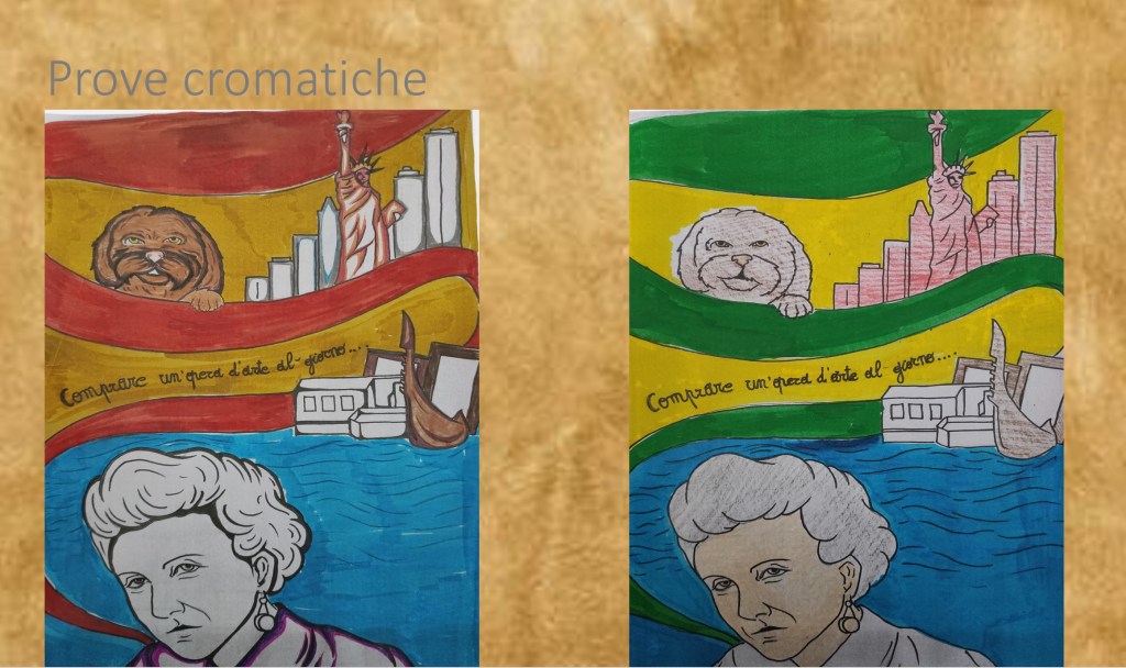Le classi IV e VA del Liceo Artistico hanno dedicato le attività di progetto alla grande mecenate Peggy Guggenheim. Dietro un/una grande artista c’è sempre una persona appassionata d’arte. Una volta si chiamavano mecenati, poi sono diventate/i collezioniste/i o galleriste/i, a cui poi si sono aggiunti critici e critiche, commentatori e commentatrici, organizzatori e organizzatrici di eventi ecc. ecc. La questione centrale non cambia: un/un’artista, per diventare grande, ha bisogno di un supporto concreto, che gli permetta di dedicarsi alla sua passione a tempo pieno. Senza Peggy Guggenheim forse non avremmo conosciuto artisti come Pollock o Dalì, e le Avanguardie artistiche del Novecento probabilmente non sarebbero avanzate in Europa con la loro potenza innovatrice. Per questo, abbiamo deciso di far raccontare alle/agli studenti la storia di Peggy Guggenheim. Nella classe quarta, dopo aver fatto una ricerca storica sulla nostra protagonista e una ricerca visiva, l’iter progettuale ha avuto inizio con la stesura della storia, gli schizzi preparatori, il bozzetto definitivo e le prove colore.
