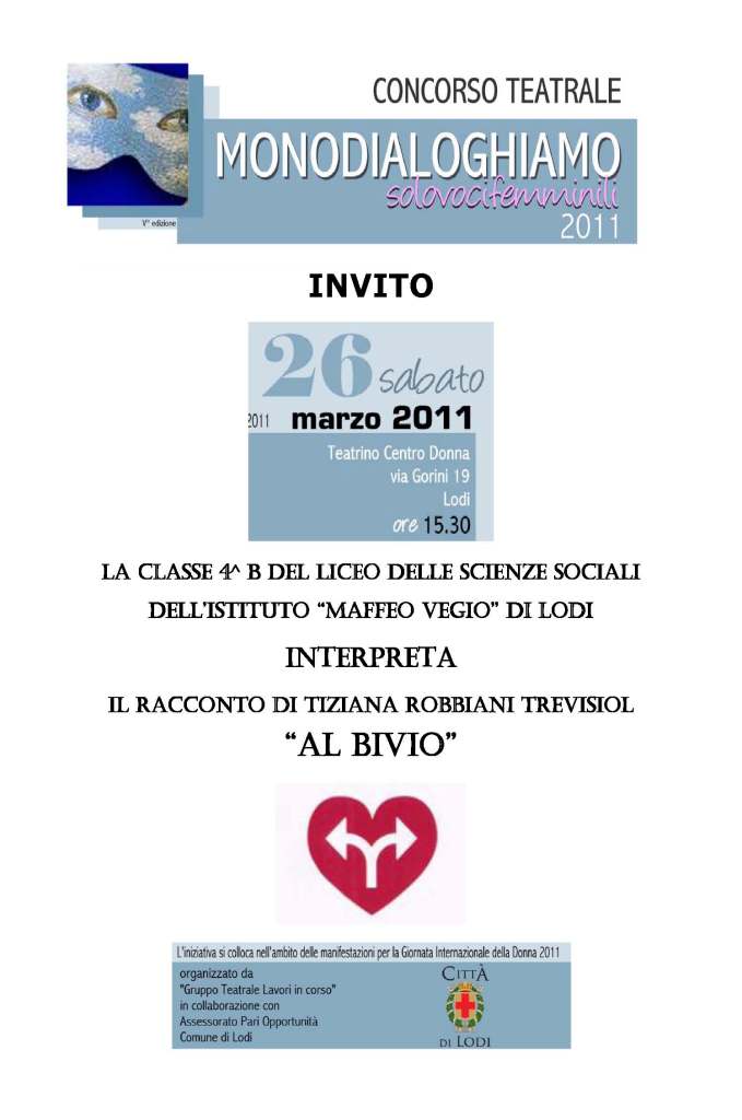 Troppo bello e toccante il racconto, tanto che la classe decise di realizzare una rappresentazione teatrale da donare alla scuola e alla cittadinanza, per far cogliere aspetti – spesso ignorati o sottovalutati – di ciò che vive chi si trova in quelle situazioni, che richiedono scelte difficili. La classe rappresentò il racconto Al bivio al teatro “Giannetta Musitelli” di Lodi, interpretandone ciascuna/o una parte, con uno studente alla chitarra e una studente alla pianola a intervallare i momenti salienti suonando piccoli brani musicali. Vi furono molti complimenti: alla classe per l’impegno, profuso anche in molti momenti extrascolastici, e a noi docenti per un’iniziativa che metteva in relazione la scuola con il territorio e con il mondo reale, esistente al di là delle quattro mura dell’aula scolastica.
