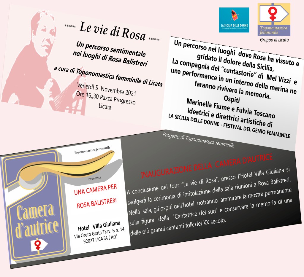 Il giorno 5, il gruppo Tf di Licata ha organizzato La via di Rosa, un percorso nei luoghi dove la cantautrice Rosa Balistreri ha vissuto e gridato il suo amore e il suo dolore per la terra siciliana. L’iniziativa ha fatto seguito all’intitolazione a Balistreri della Sala Convegni dell’hotel Villa Giuliana, sempre a Licata, ottenuta grazie al lavoro delle socie del gruppo locale di Toponomastica femminile e delle direttrici artistiche del festival La Sicilia delle donne, Fulvia Toscano e Marinella Fiume.
