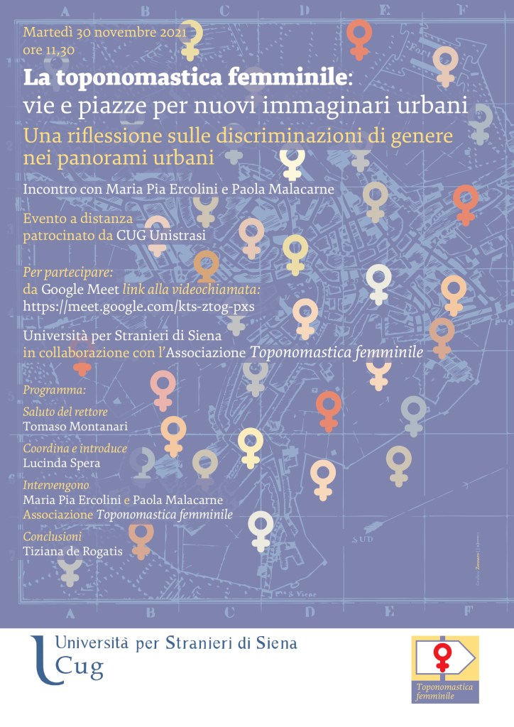 Il 30, Maria Pia Ercolini e Paola Malacarne sono state protagoniste dell’evento organizzato dall’Università per Stranieri di Siena, dal titolo La toponomastica femminile: vie e piazze per nuovi immaginari urbani. Una riflessione sulle discriminazioni di genere nei panorami urbani. Presente, Tomaso Montanari, il magnifico rettore dell’ateneo toscano.