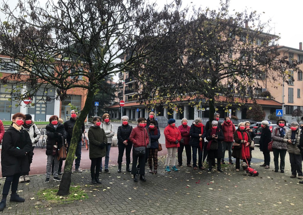 Il 27 novembre, a Melegnano, la via Giuseppina Biggiogero, una delle poche intitolate alle donne, si è colorata di rosso. Una folla di piumini, giacche e cappotti rossi, e tanti volti con la mascherina rossa, intorno alle 11, ha riempito la piazzetta antistante. I passanti curiosi e le persone affacciate alle finestre si chiedevano che cosa si stesse per celebrare. Si trattava dell’intitolazione del Largo 25 novembre, Giornata internazionale contro la violenza sulle donne e il femminicidio, patrocinata dal Comune di Melegnano e proposta congiuntamente dalla locale Banca del tempo e da Toponomastica femminile.