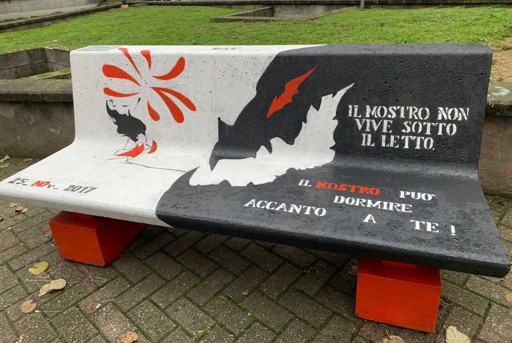 Abbiamo voluto che in Largo 25 novembre fosse presente la panchina di Silvia e oggi di Silvia, l’artista che l’ha realizzata, vi vogliamo parlare. Silvia era una ragazza problematica, che si era avvicinata alla Banca del tempo insieme alla sua mamma e vi aveva trovato conforto ed accoglienza. Raccontava di essere stata abusata all’età di 9 anni e questo aveva minato il suo equilibrio e l’aveva resa più fragile. Aveva frequentato il Liceo artistico “Piazza” di Lodi ed era diventata molto brava, aveva una capacità manuale notevole e realizzava opere bellissime, ma non era mai riuscita a mantenersi un lavoro. Amava i gatti e viveva in una casa umile con la sua mamma. Con grande passione si era dedicata alla realizzazione di questa panchina, in occasione della Giornata del 25 novembre. Silvia era una giovane omosessuale, una persona non allineata e non omologata a questa società, le sue storie spesso finivano male e negli ultimi mesi della sua vita era stata ricoverata in psichiatria, dove aveva fatto coming out. Silvia si era affezionata alle donne della Banca del tempo, in particolare a una di loro che l’aveva fatta conoscere alla propria famiglia e di lei la ragazza era solita dire, con grande riconoscenza per quell’affetto insperato e che forse considerava immeritato, che questa persona era la sua seconda mamma. Silvia purtroppo non ce l’ha fatta, il peso della vita era troppo forte per lei e chissà quali ferite aveva prodotto sulla sua anima quell’abuso. Ha deciso di togliersi la vita il 5 giugno del 2018, gettandosi sotto un treno, alla stazione di Melegnano. La panchina di Silvia, che tutti e tutte potete vedere, era stata dapprima portata alla stazione, ma il posto era isolato e la posizione non rendeva giustizia all’artista autrice dell’opera. Adesso è qui, nel posto più giusto, in quel Largo 25 novembre che ricorda tutto il male fatto a Silvia e a tante altre donne.