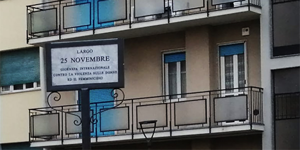 Il 27 novembre, a Melegnano, la via Giuseppina Biggiogero, una delle poche intitolate alle donne, si è colorata di rosso. Una folla di piumini, giacche e cappotti rossi, e tanti volti con la mascherina rossa, intorno alle 11, ha riempito la piazzetta antistante. I passanti curiosi e le persone affacciate alle finestre si chiedevano che cosa si stesse per celebrare. Si trattava dell’intitolazione del Largo 25 novembre, Giornata internazionale contro la violenza sulle donne e il femminicidio, patrocinata dal Comune di Melegnano e proposta congiuntamente dalla locale Banca del tempo e da Toponomastica femminile.