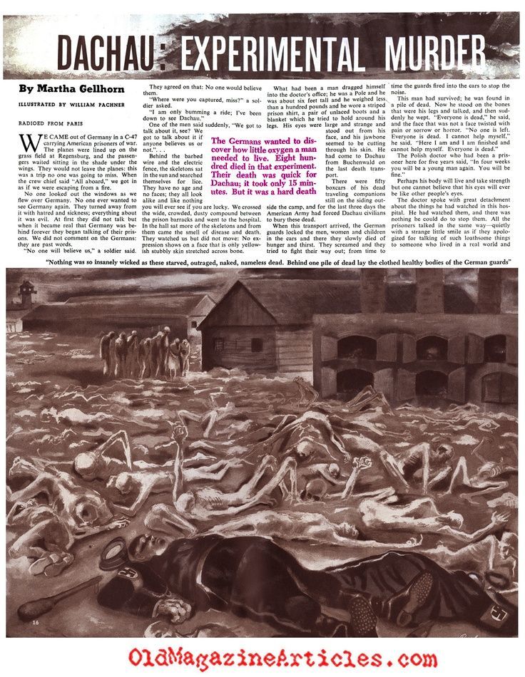Dopo una nuova pausa in Italia, impoverita e dilaniata ma sempre affascinante ai suoi occhi, da dove inviò alcuni dei suoi pezzi più belli e significativi nel raccontare la tragica epopea sulla Linea Gotica, l’attendeva l’orrore, da cui forse non si riprese più. Da Monaco raggiunse infatti Dachau con le truppe americane e entrò nel campo; da questa esperienza traumatica nacque uno dei suoi articoli più coinvolgenti e spietati: Dachau: Experimental Murder. È la primavera del 1945: il divorzio, un nuovo amore di breve durata, l’Europa in rovina; potrà Martha essere di nuovo felice? si domanda Gruber.