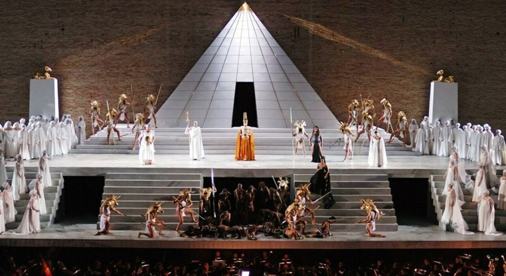 Ma veniamo agli altri anniversari: dopo 50 anni dal debutto, nel 1921 lo Sferisterio di Macerata, proprio con la rappresentazione di Aida, si trasformò in teatro e l’estate scorsa, a distanza di 100 anni, l’opera è stata messa in scena nuovamente, in una interessante edizione, all’interno del Festival, sotto la direzione del maestro Francesco Lanzillotta e la regia dell’argentina Valentina Carrasco.