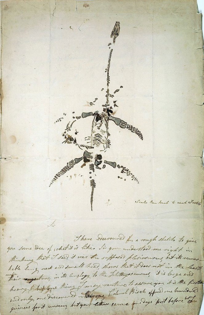 Lettera e disegno di Mary Anning, sulla scoperta del Plesiosaurus dolichodeirus, 1823