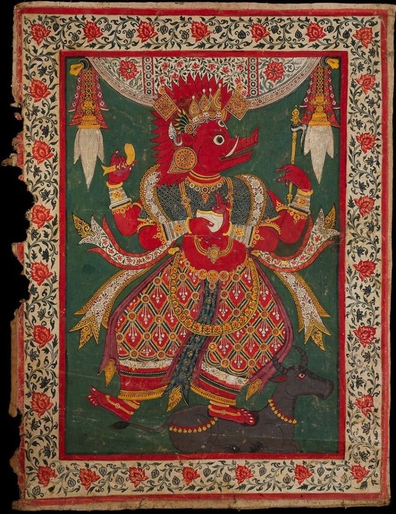 Torniamo ora all’inizio della creazione narrata dai Veda, quando un minuscolo cinghiale bianco uscì dalla narice di Brahma, e prima che lui potesse accorgersene, il cinghiale espanse il suo corpo nel cielo con la dimensione di un grande elefante. All’inizio Brahma rimase stupito, ma poi capì che si trattava di un’incarnazione divina. Il frastuono del grugnito dell’incarnazione-cinghiale piacque a Brahma che si sentì rassicurato dal fatto che avrebbe risolto tutti i suoi problemi.