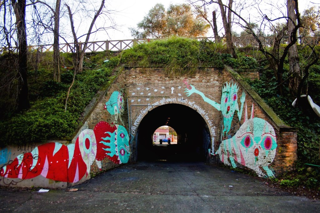 Anche l’artista romana Giò Pistone instaura un rapporto con la superficie su cui opera, come per esempio nell’intervento per l’Ecomuseo Casilino al Quadraro Vecchio dove, nel 2012, ha dipinto l’entrata di un tunnel, un importante punto di accesso al quartiere. Sempre rispettando il suo stile costellato da figure mostruose che non spaventano ma che anzi, invitano ad avvicinarsi, Giò Pistone ha dato vita ai “guardiani del tunnel”, così come li hanno chiamati i residenti.