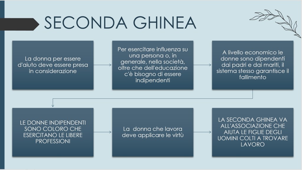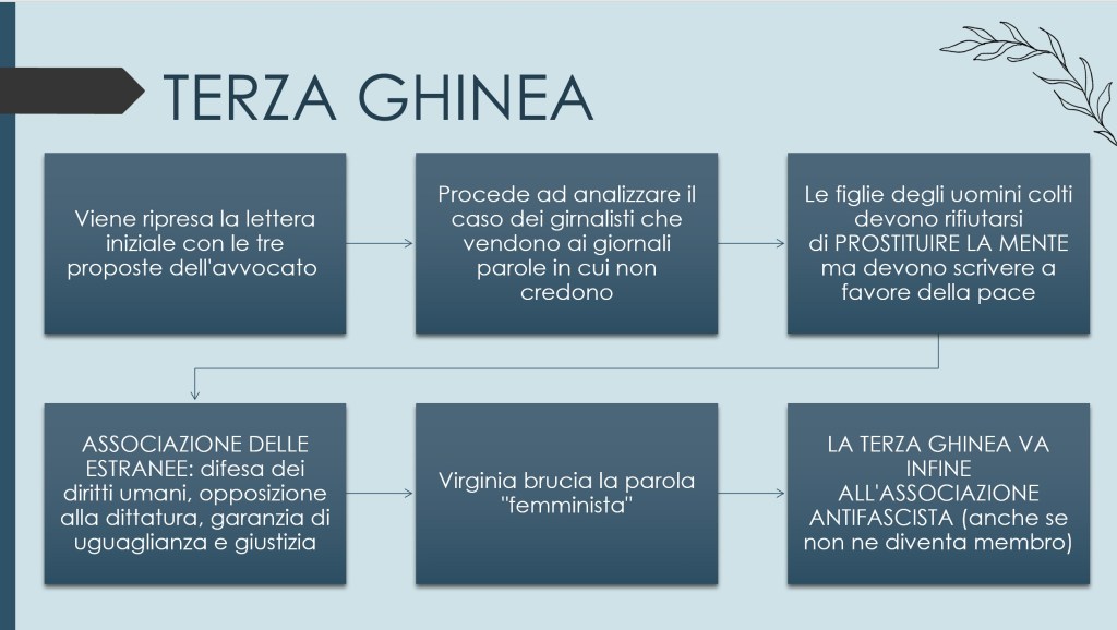 La docente Daniela Tuscano ha così indicato le fasi del progetto, realizzato con un prodotto multimediale dalla studente Sofia Barbieri e successivamente presentato alla classe e all’istituto: «L’attività è stata svolta quasi interamente in Dad, sia per l’elaborazione del progetto digitale in power point (testi, grafica, immagini) sia nella presentazione alla classe. Le fasi di lavoro hanno previsto la lettura de Le tre ghinee, l’elaborazione della biografia di Virginia Woolf, l’analisi del testo da un punto di vista letterario (flusso di coscienza) e dei contenuti, la discussione – presente all’interno del testo – per affrontare la tematica della guerra, evidenziando la rivoluzione del pensiero di Virginia Woolf nel parlare della possibilità di prevenire la guerra destrutturando il modello di società basato sui valori maschili e favorendo l’emancipazione femminile».