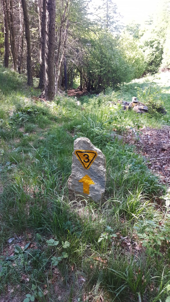 C’eravamo lasciati/e alla lapide dei partigiani, barbaramente trucidati dai nazifascisti ad Arnad. Da qui ripartiamo, sempre seguendo il segnavia 3 nel triangolo rovesciato, che indica 5 ore e 20 di cammino alla prossima tappa.