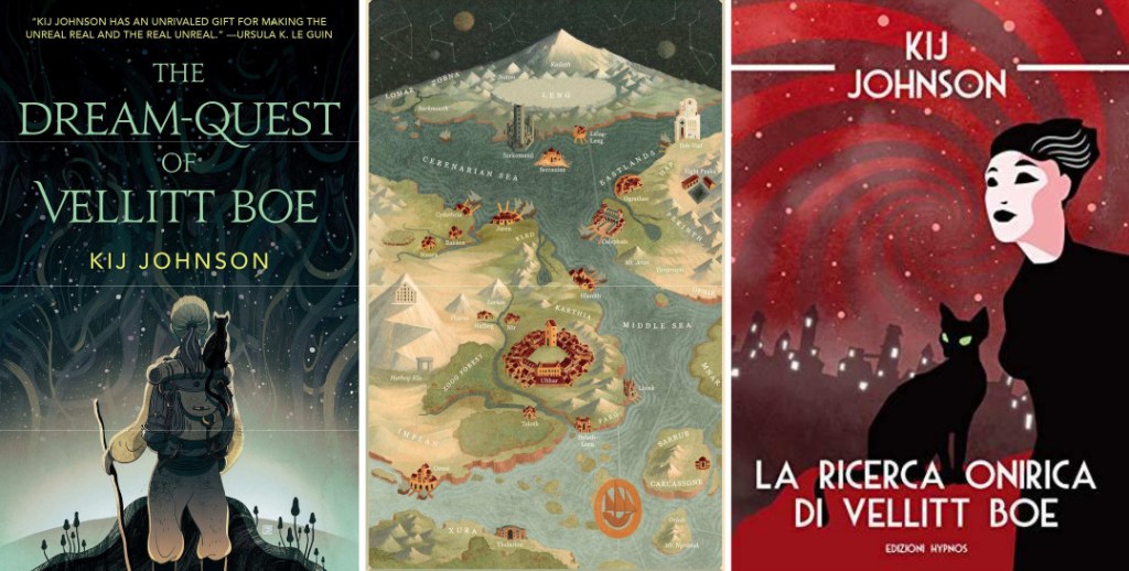 Bello, molto bello, è il romanzo breve The Dream-Quest of Vellit Boe (2016), con pieno merito vincitore del World Fantasy Award nel 2017, proposto in traduzione italiana l’anno successivo da Edizioni Hypnos con il titolo La ricerca onirica di Vellit Boe. La protagonista è un’insegnante di matematica del Collegio Femminile di Ulthar, Vellit Boe, appunto: «una donna dagli occhi severi in abiti da viaggio di tweed, con pesanti stivali ai piedi e capelli neri striati d’argento legati indietro per lasciare libero il volto dalle linee profonde. Una donna invecchiata, ma non ammorbidita». Una donna di cinquantacinque anni, esattamente l’età di Kij Johnson al tempo in cui scrive il testo, per quanto l’autrice, nell’intervista a cura di Luca Tarenzi in appendice all’edizione italiana, dichiari di essere sempre stata «una di quelle ragazze incostanti che Vellit cerca di aiutare: lei è una persona molto più concentrata e sensibile di me». Eppure, a ben guardare, scrittrice e personaggio presentano affinità, non soltanto anagrafiche: per esempio, la professione di docente, l’attitudine al sogno, l’amore per i gatti (anzi, le gatte), la passione per il camminare…