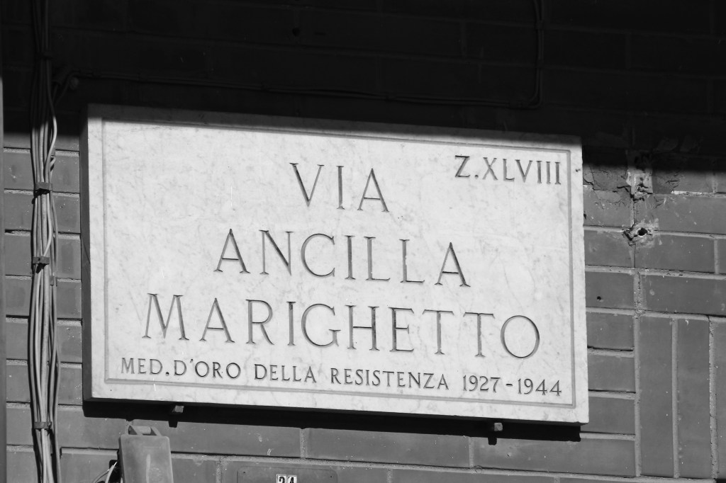 Andando avanti da via Clorinda Menguzzato è possibile trovare via Ancilla Marighetto (1927-1945). La strada è dedicata alla partigiana, conosciuta con il nome di battaglia di “Ora” e operativa come staffetta nelle Brigate Garibaldi del Trentino. Catturata dopo una fuga sulla neve viene interrogata, ma poiché non rilascia nessuna informazione ai nazisti viene brutalmente giustiziata con numerosi colpi di pistola alla nuca nello stesso luogo.
