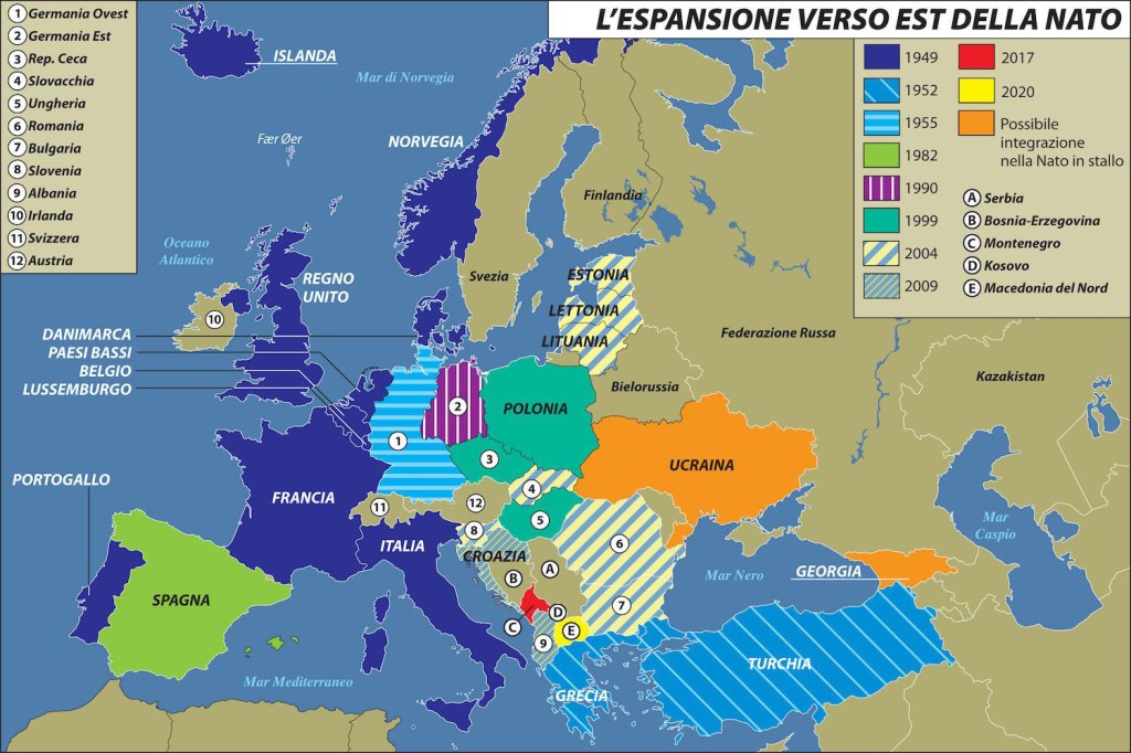 L’articolo 10 stabilisce che le parti «possono», con accordo unanime, invitare a aderire al trattato ogni altro Stato europeo in grado di favorire lo sviluppo dei princìpi dello stesso e di «contribuire alla sicurezza della regione dell’Atlantico settentrionale». […] Inoltre, il vincolo dell’unanimità conferisce a ciascun membro un pari diritto di veto che ne rispetta la dignità ma lo rende anche individualmente responsabile delle conseguenze del mancato esercizio di tale diritto. Quindi non impedire l’ingresso nell’Alleanza di tutti quei paesi che avrebbero alterato gli equilibri, minacciato la propria sicurezza e quella di altri paesi è stata una violazione del Trattato Atlantico e dello stesso statuto dell’Onu. Tutti sapevano che la Polonia e i paesi baltici avrebbero alterato tali equilibri e la Russia non era nelle condizioni d’impedirlo. Lo erano però la Germania, la Norvegia, la Francia, l’Italia e perfino il Lussemburgo, ma non hanno fatto o detto nulla. A partire dal 1997 ci sono stati vari cicli di ammissione di nuovi membri, fino all’adesione della Macedonia nel 2018, che hanno portato a trenta i membri dell’Alleanza e a chiudere la Russia su tutti i lati tranne quello ucraino. Oggi tutti assistono stupiti al fatto che la Federazione è in grado di far valere i propri diritti e soprattutto le ragioni della propria sicurezza…» Mi fermo qui ma la lettura di tutto l’articolo è vivamente consigliata, proprio perché è scritta da chi è sempre stato sul campo e conosce i trattati dell’organizzazione internazionale militare molto bene.