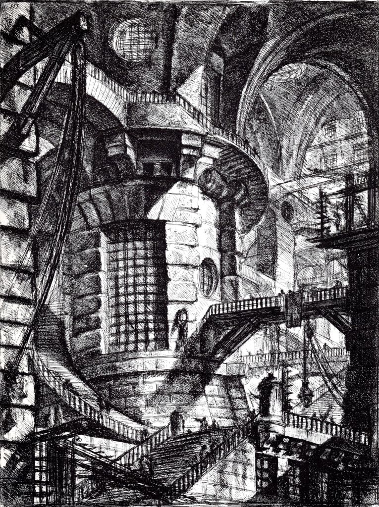 Ed ecco i quattro episodi centrali (che si incontrano scorrendo le pagine: il volumetto Urania 1672 non fa eccezione alla pessima, ormai imperante consuetudine di non includere l’indice). Il primo, Antenora, ha come protagoniste Sarah, medico reclusa condannata alla detenzione, e Alex, ribelle divergente e coraggiosa: il loro incontro è casuale ma destinico, le rende capaci di aprirsi alla reciproca comprensione e solidarietà, di svelare l’una all’altra la propria vita devastata dal dolore, dalla malattia, dalla morte; Sarah in una narrazione in terza persona, con registro referenziale ma empatico, Alex, invece, in soggettiva ravvicinata e includente (che a chi scrive ha ricordato Il figlio di Saul, film d’esordio di László Nemes, del 2015). Il riferimento al Sonderkommando e ad Auschwitz non è casuale: Antenora è luogo di orrore assoluto, un pozzo a sua volta diviso in piani sovrapposti, fino al famigerato Livello 9; qui operano (presunti) scienziati e (sedicenti) medici epigoni di Joseph Mengele, da qui, e non solo, i «Monatti» (omaggio all’opera manzoniana) fanno sparire i cadaveri in sacchi neri, come «nero e sordo» è il dolore delle vittime. Altro riferimento visivo ben presente a Cavallero sono le Carceri d’invenzione, serie di acqueforti realizzata da Giovan Battista Piranesi tra 1760 e 1761, nelle quali incombe il gigantismo cupo di colonne e archi, scalinate e corridoi che sembrano diramarsi all’infinito.