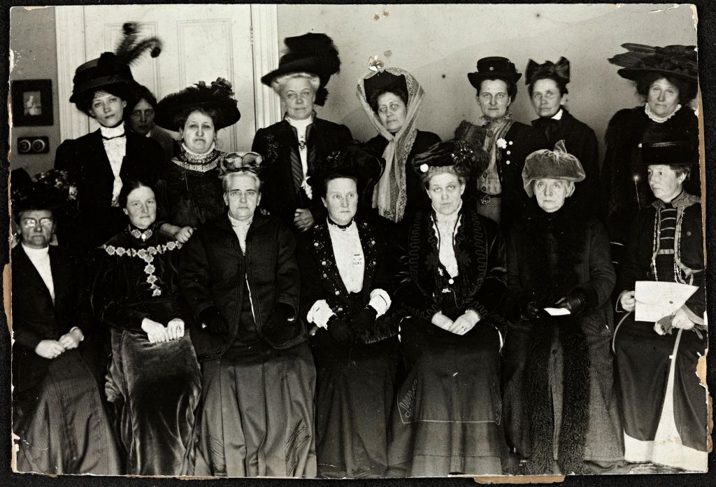 Riga in alto da sinistra: Thora Dangaard (Danimarca), Louise Qvam (Norvegia), Aletta Jacobs (Paesi Bassi), Annie Furuhjelm (Finlandia), Madame Mirowitch (Russia), Käthe Schirmacher (Germania ) ), Madame Honneger, non identificata. In basso a sinistra: Unidentified, Anna Bugge (Svezia), Anna Howard Shaw (USA), Millicent Fawcett (Presidente, Inghilterra), Carrie Chapman Catt (USA), FM Qvam (Norvegia), Anita Augspurg (Germania).