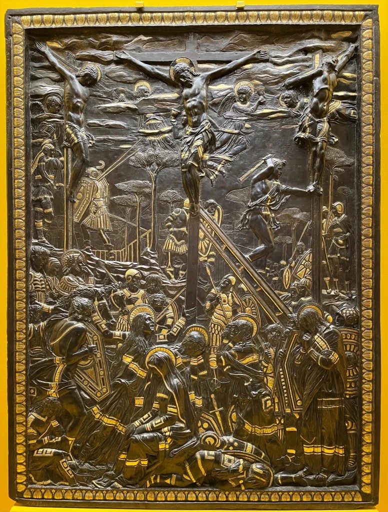 Di seguito colpiscono, nella produzione padovana, il Miracolo della mula e l’imponente Crocifisso in bronzo, il primo mai realizzato in Italia, a cui si unisce il gruppo bronzeo di cinque grandi figure, opera di Baroncelli, per la Cattedrale di Ferrara. Stiamo arrivando alla fase conclusiva dell’artista: ancora in Toscana, ma a Siena, vedono la luce l’emozionante lastra Pecci, sepolcro antiretorico e antieroico, il San Giovanni Battista legato all’iconografia tradizionale, barbuto, macilento e vecchio, e la delicata Madonna Chellini.