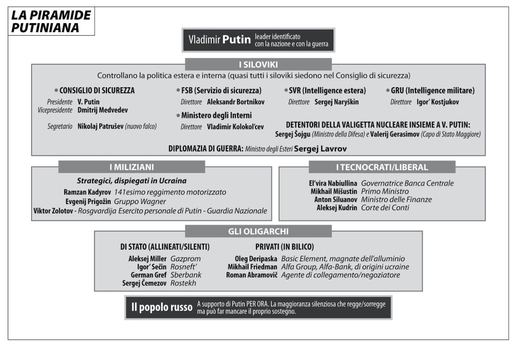 Per capire che cos’è e come funziona il sistema russo è fondamentale l’articolo della esperta di Russia e docente alla scuola di Limes, nonché redattrice di Askanews Orietta Moscatelli, Russia=Putin Putin=Russia. Il putinismo nasce nel 1998 a Lubjanka, anno in cui Putin appena nominato capo dell’intelligence russa, comincia a piazzare ai piani alti del Servizio amici, colleghi, sodali trasferiti a Mosca dalla natia San Pietroburgo. Alcuni sono ancora al loro posto, altri sono stati sostituiti. Il progetto di aggressione dell’Ucraina è stato condiviso dalla cerchia putiniana ma la decisione è spettata al leader carismatico, ancora molto gradito al popolo russo. Secondo alcuni istituti demoscopici vicini al Governo il rating di Putin presso il popolo russo è81,6% Il Centro Levada, il più indipendente, registrava un 53% di russi completamente schierati a favore e un 28% «più favorevoli che no». Tale sostegno per una guerra «confezionata a tavolino», che ha cagionato la morte di tanti soldati russi e ha comportato sanzioni internazionali definite “nucleari” per la loro dimensione, fino ad ora mai sperimentata, non può essere liquidato come mero effetto della propaganda o del timore di esporsi, così come piacerebbe interpretarlo a noi, secondo i nostri inossidabili criteri occidentali. Gli americani sperano che presto tutto cambi e che eliminare Putin significherà trovarsi di fronte una Russia completamente cambiata, secondo la teoria della guerra di Putin. «Pia speranza – sostiene Moscatelli – che tradisce l’incomprensione della psiche collettiva russa e del putinismo nella sua duplice natura e funzione: quella di schema gestionale, ovvero di ingranaggio che assicura il funzionamento del potere, e di codice di idee e valori accettati dalla maggioranza della popolazione». L’articolo dell’autorevole docente della scuola di Limes procede ripercorrendo i passaggi della traiettoria putiniana. Il ritorno di Putin nel 2012 al potere, dopo la parentesi del fido Medvedev, lo vede ossessionato dall’idea della minaccia americana, non solo ai confini ovest a causa dell’espansione della Nato ma anche all’interno. «Famiglia, radici cristiane, memoria storica, patriottismo: negli ultimi dieci anni il putinismo nella sua funzione di collettore valoriale si è posizionato in crescente opposizione all’Occidente. La narrazione è imperniata sulla Russia sotto assedio, alternativa a una civilizzazione condannata a definitivo declino per negazione delle proprie radici». Secondo il nuovo zar che non vuole passare alla storia per aver perso l’Ucraina, «il popolo russo sarà sempre in grado di distinguere i veri patrioti dalla feccia e dai traditori. E li sputerà fuori, come si fa con un insetto che ti è volato accidentalmente in bocca, li sputerà sul marciapiede». Un apparato securitario fortissimo e una legislazione accurata hanno bloccato le proteste contro la guerra, mai nominata così. «La revisione della costituzione di due anni fa ha fissato gli ideali putiniani quali princìpi fondamentali dello Stato.