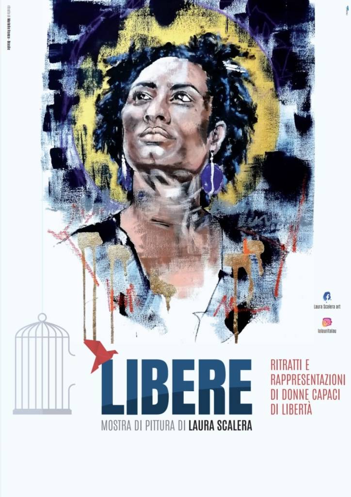 Il suo nome l’avevo letto a una mostra ospitata nella sede di un’associazione locale: Libere – Ritratti e rappresentazioni di donne capaci di libertà. Sulle tele erano dipinti volti di donne che, a vario titolo e in vari contesti, hanno rotto gli schemi, si sono battute per la propria e per l’altrui libertà: da Marielle Franco a Iris Versari, da Nina Simone a Franca Rame, passeggiando per diciotto storie, abilmente accennate nelle didascalie che accompagnano le opere, che accendono la mia curiosità nel colmare varie lacune. Nel pannello introduttivo si legge: «… la mostra guida il visitatore e la visitatrice in un viaggio Geo-Grafico e temporale tra colori intensi ed energiche pennellate, per raccontare ritratti di donne impegnate a lottare perché nere, perché lesbiche, perché transgender, perché donne». In tutta la presentazione, però, non c’è traccia scritta dell’artista, della sua biografia e della sua storia: solo il nome, Laura Scalera.