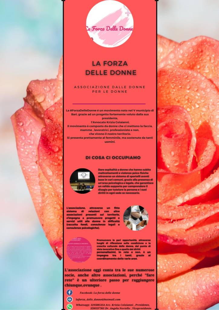 «La Forza delle donne é un movimento nato in Puglia, precisamente nel V municipio di Bari, grazie alla tenacia della presidente, avv. Krizia Colaianni, con l’obiettivo di tutelare a 360 gradi le donne vittime di violenza. È un’associazione no profit prettamente al femminile, ma anche sostenuta da tanti uomini, che persegue lo scopo prioritario di contrastare la violenza di genere e tutelare, mediante le tre aree di riferimento legale, psicologica e medica, le donne che si rivolgono all’associazione in quanto vittime di violenza domestica e/o psico-fisica, maltrattamenti e stalking, fornendo loro un supporto di tipo morale, legale e psicologico sia attraverso un gruppo Whatsapp di mutuo aiuto, sia attraverso gli sportelli di ascolto attivi nei municipi di Bari-Palese e di Bari-Picone-Poggiofranco».