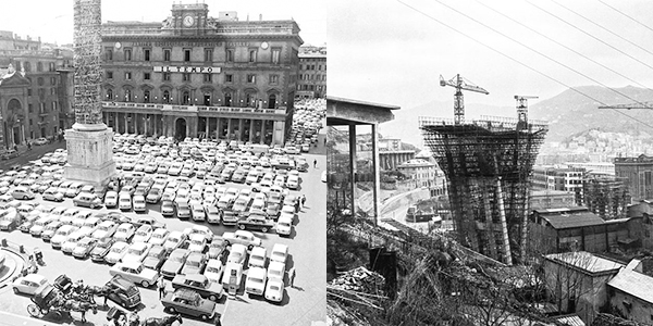 A destra: Il viadotto Polcevera (ponte Morandi) in costruzione, Genova, 1963-1967, autore non indicato