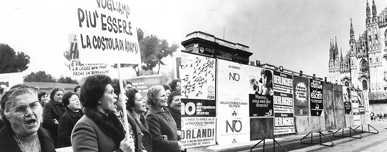 Un ruolo fondamentale è quello delle donne. Già nel 1966, la siciliana Franca Viola aveva rifiutato di sposare il suo rapitore. Lo stupro e la violenza domestica non sono ancora considerati reato e la donna è ancora una proprietà del marito. È necessario e urgente cambiare il diritto di famiglia. Una fotografia ritrae una manifestazione femminista in cui un cartello mostra la scritta «Non vogliamo più essere la costola di Adamo». Nel 1974 l’emancipazione dalla Chiesa ottiene una vittoria importante al referendum, voluto dalle destre e fallito, per abrogare la legge “Fortuna-Baslini”, approvata il 1° dicembre 1970, che permetteva finalmente il divorzio anche in Italia.