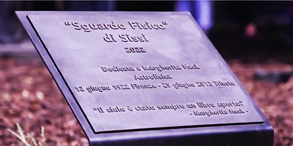 Quando tra aspettative e incontri ha inizio la cerimonia, il drappo cade tra gli applausi e Margherita Hack appare come nata, solo 100 anni fa, dagli elementi di una galassia, con le braccia tese a esplorare le stelle, attraverso le mani di colore d’oro, senza nessuno strumento: non a caso il titolo dell’opera è Sguardo fisico. Sissi, la giovane scultrice, si affianca alla statua in bronzo alta 270 cm, da lei creata: commossa e affascinante nel suo vestito color oro.