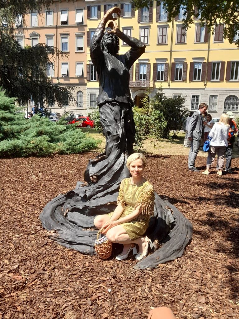 A Milano, in largo Richini, col suggestivo sfondo dell’Università Statale, sotto a una carta azzurra si intuiva una figura indefinibile: solo chi era addentro alle “segrete cose” sapeva che cosa sarebbe apparso il 13 giugno 2022, quando, nella seconda metà della mattinata, un gruppo di persone inizia a raccogliersi intorno alla figura, coperta ora in modo diverso, da un velo bianco e rosso, mentre una musica si diffonde nell’aria, una musica sospesa e ripresa alla fine della cerimonia col concerto in Re minore di Fanny Mendelssohn, a cura della Filarmonica di Milano.