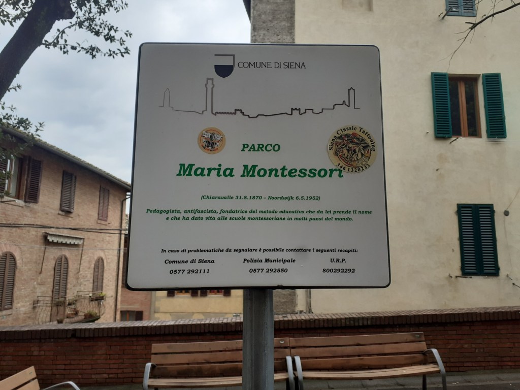 Intitolare un luogo cittadino a questa figura femminile, rappresenta un modo per ricordare una donna che partendo dalle umili origini, si è affermata in un ambiente, quello della scrittura teatrale e della poesia, che risulta essere ancora oggi fin troppo appannaggio dei soli uomini. Proseguendo, un’altra scritta colpisce la nostra attenzione, area verde Maria Montessori: in questo caso una grande figura femminile ha ricevuto una meritata intitolazione!