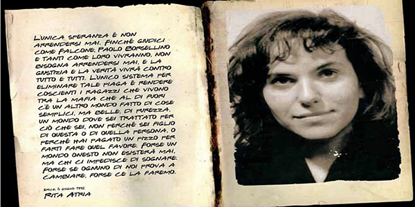 Nota bene: le frasi in corsivo sono tratte dal tema che Rita Atria scrisse in occasione degli esami da privatista che sostenne a Roma, mentre era sotto falsa identità, sotto il programma di protezione dell’Alto commissariato per la lotta alla mafia. La fonte è il libro Le ribelli. Storie di donne che hanno sfidato la mafia per amore di Nando dalla Chiesa, edito da Melampo, che contiene un capitolo sulla storia di questa coraggiosa e giovanissima testimone di giustizia.