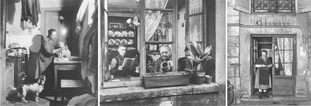 La sezione successiva è intitolata Scènes d’intérieurs. Coerentemente con il suo stile umanista, Doisneau mostra il quotidiano anziché lo straordinario, anzi, è proprio nella normalità di tutti i giorni che egli cerca la bellezza. Le fotografie sono state scattate nei bistrot parigini, girati insieme al poeta Robert Giraud, e nelle case-guardiole, le portinerie dei palazzi di lusso. «I veri portinai e le vere portinaie (il termine concièrge in francese è sia maschile che femminile) esistono soltanto a Parigi. Parigi non può essere concepita senza i suoi portinai e le sue portinaie», afferma il fotografo. Dedicate a un mestiere quasi del tutto scomparso, oggi rimpiazzato dai citofoni, le immagini qui esposte sono state pubblicate sulla rivista Vogue. L’immagine della signora con il gatto non può non far pensare a Renée Michel, la colta portinaia parigina protagonista del romanzo L’eleganza del riccio di Muriel Barbery, e al suo amato felino Léon.