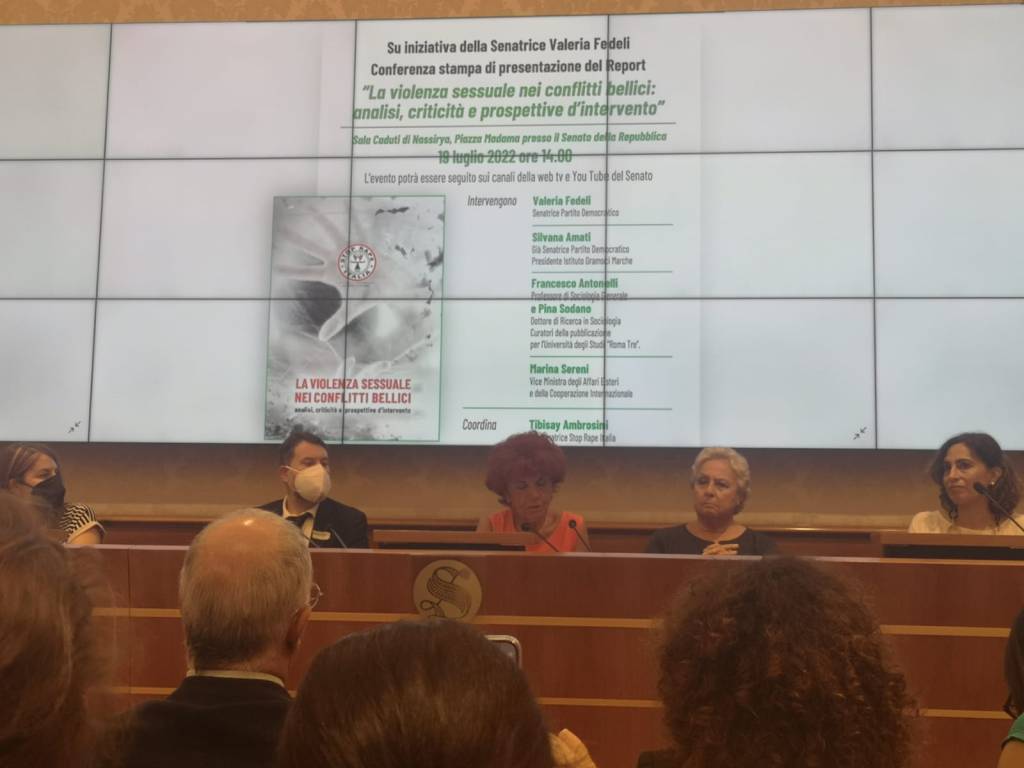 «La guerra è profondamente reazionaria e regressiva: detesta le libertà e la rivendicazione dei diritti. Probabilmente è per questo che piace tanto ai tiranni. Chi ancora pensa e scrive che lo stupro è un atto che viene acceso da un impeto sessuale, anzi da un desiderio improvviso e focoso nei riguardi del corpo femminile, sbaglia di grosso. Lo stupro, soprattutto quello di gruppo, sconosciuto fra gli animali, è un’arma intimidatoria tutta umana, e ha un valore simbolico grave e devastante». È con questa citazione di Dacia Maraini che si apre la conferenza per la presentazione del report La violenza sessuale nei conflitti bellici, tenuta al Senato nella sala Caduti di Nassiriya il 19 luglio alla presenza della senatrice Valeria Fedeli e della viceministra agli Affari esteri Marina Sereni. Il report è stato redatto dall’associazione Stop Rape Italia con lo scopo di analizzare il fenomeno della violenza sessuale come strumento di guerra e genocidio, in occasione della VIII edizione della Giornata Internazionale contro l’eliminazione della violenza sessuale dai conflitti indetta dall’Onu nel 2015. Sono presenti anche Tibisay Ambrosini, coordinatrice di Stop Rape Italia e moderatrice dell’evento, l’ex senatrice Silvana Amati, che ha scritto l’introduzione al report, il professor Francesco Antonelli e la dottoressa Pina Sodano, che ne sono stati i curatori.